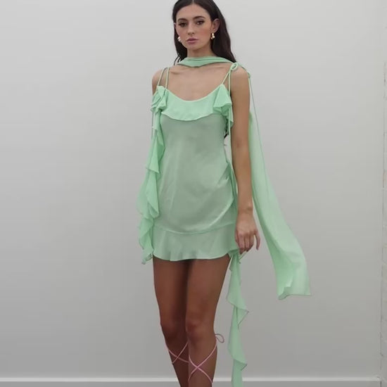The Luna Dress is designed to feel light, intimate, and effortlessly feminine. Crafted from airy chiffon, it drapes softly over the body, creating a sheer, fluid silhouette that moves with ease and intention. Delicate straps and subtle ruffle detailing frame the neckline, while cascading panels add movement and undone elegance. The mini length keeps the look fresh and modern, balancing softness with a quiet confidence. Crafted by our bespoke makers in Bali, it includes a complimentary nude slip for a sheer layered or covered finish.
