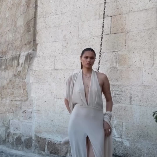 This gown is crafted from luxurious poly chiffon, doubled for a smooth, flowy finish that exudes elegance. The deep V neckline is both daring and sophisticated touch, offering adjustable lengths to suit your style. This versatile gown can be worn in two distinct ways: leave the ties open for an elegant scarf-like effect, or tie them up for a more cinched, snatched silhouette. The design features a beautiful, flowing skirt with a slit that adds a hint of allure, perfect for any formal occasion. Whether you choose to wear it in a relaxed, draped style or with a more defined shape, this gown is designed to make you feel effortlessly graceful