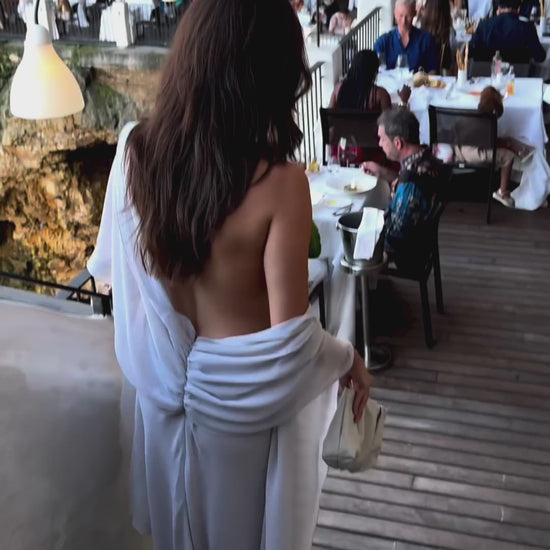 This gown is crafted from luxurious poly chiffon, doubled for a smooth, flowy finish that exudes elegance. The deep V neckline is both daring and sophisticated touch, offering adjustable lengths to suit your style. This versatile gown can be worn in two distinct ways: leave the ties open for an elegant scarf-like effect, or tie them up for a more cinched, snatched silhouette. The design features a beautiful, flowing skirt with a slit that adds a hint of allure, perfect for any formal occasion. Whether you choose to wear it in a relaxed, draped style or with a more defined shape, this gown is designed to make you feel effortlessly graceful