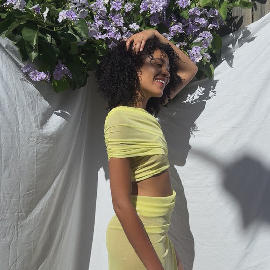 show-stopping yellow one-shoulder gown crafted from glitter mesh that wraps the frame with modern elegance. Designed to catch the light and flatter every curve, it's made for balmy nights and bold entrances. The Lara is made for nights that call for confidence, presence, and a touch of shimmer.