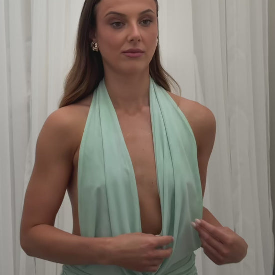 This halter mini dress features a draped cowl neckline and a ruched waist, highlighted by an attached bow detail that extends into cascading fabric. The asymmetrical layered skirt adds movement.