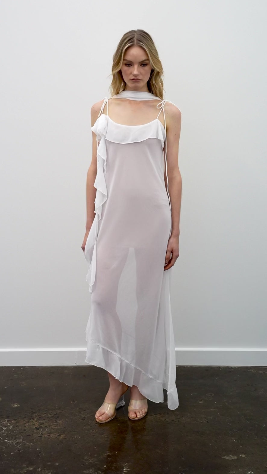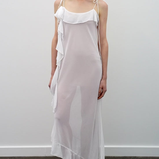 The Luna Dress in Ivory is a study in light, intimate, and effortless femininity. Crafted from airy chiffon, it creates a sheer, fluid silhouette that moves with intention. Delicate straps and subtle ruffle detailing frame the neckline, while cascading panels add movement and undone elegance. The mini length keeps the look modern, balancing softness with quiet confidence. Crafted by our bespoke makers in Bali, it includes a complimentary nude slip for a sheer layered or covered finish.
